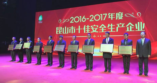 其中,華辰裝備獲頒2016~2017年度昆山市“十佳安全生產企業”殊榮,華辰裝備董事長曹宇中先生登臺接受昆山市副市長宋德強頒獎。